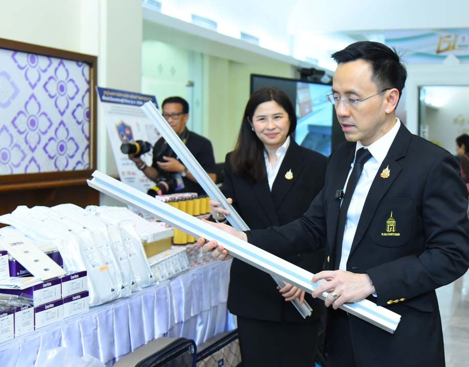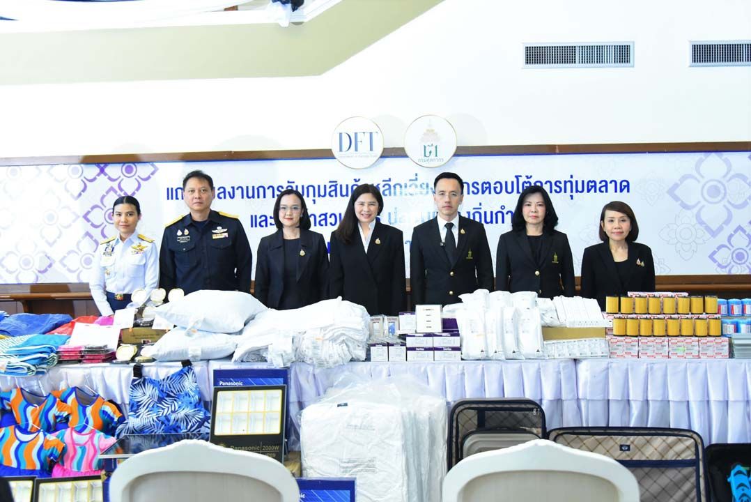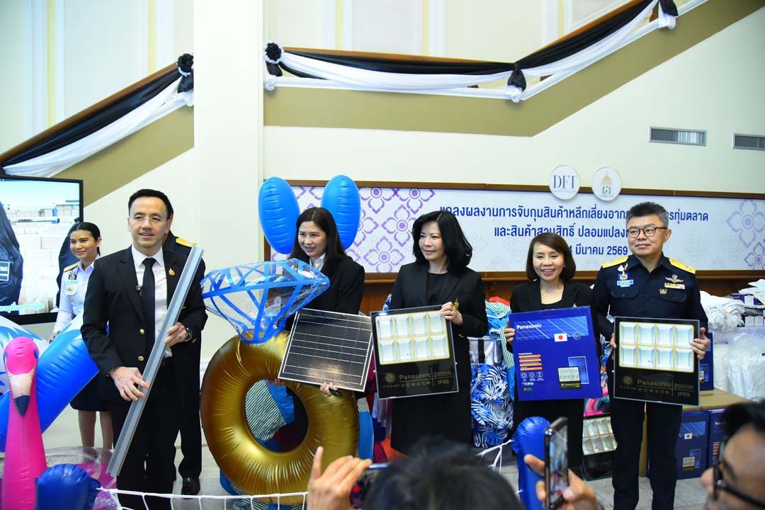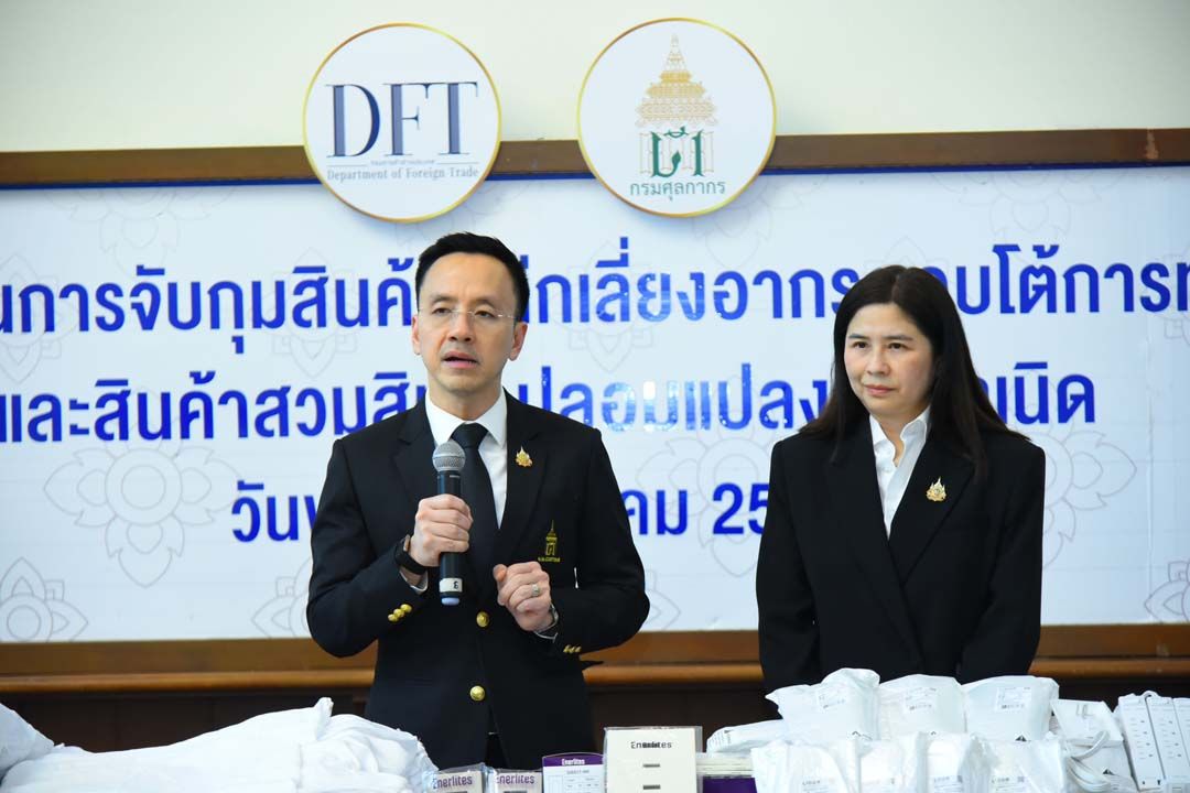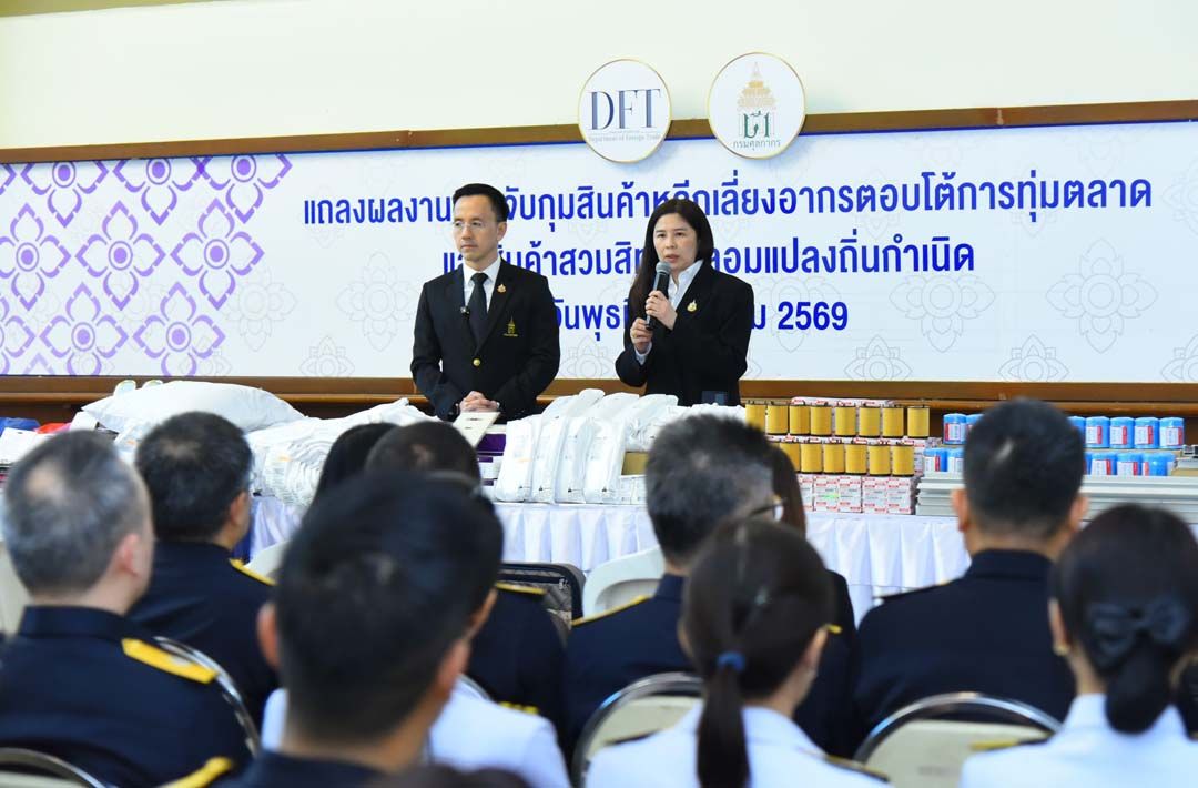 นายพันธ์ทอง ลอยกุลนันท์ อธิบดีกรมศุลกากร และนางอารดา เฟื่องทอง อธิบดีกรมการค้าต่างประเทศ ร่วมแถลงผลงานการจับกุมสินค้าหลีกเลี่ยงอากรตอบโต้การทุ่มตลาด และสินค้าสวมสิทธิ์ปลอมแปลงถิ่นกำเนิด ตั้งแต่ต้นปีงบประมาณ 2569 มูลค่าความเสียหายกว่า 503 ล้านบาท ณ ห้องโถงชั้น 1 อาคาร 1 กรมศุลกากร