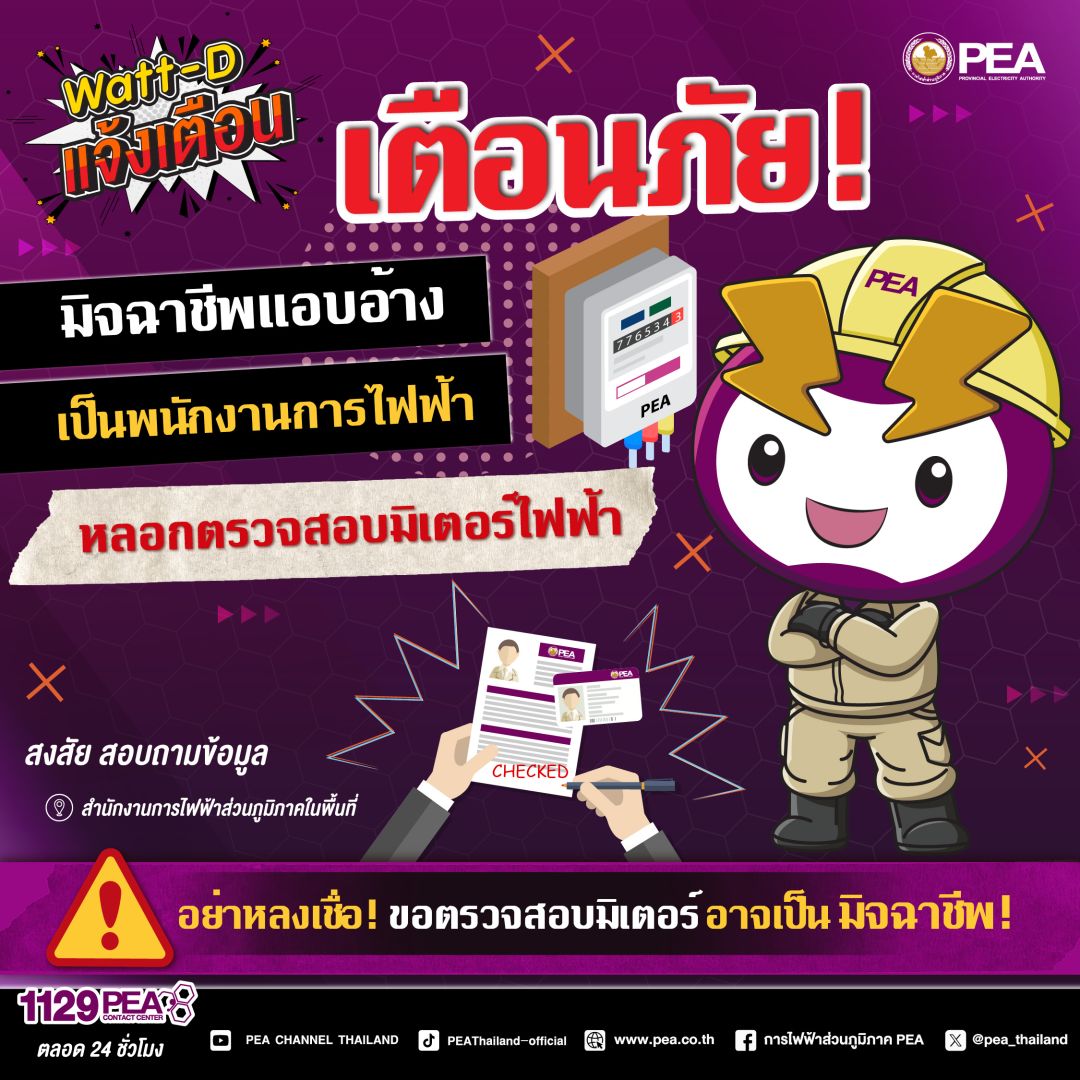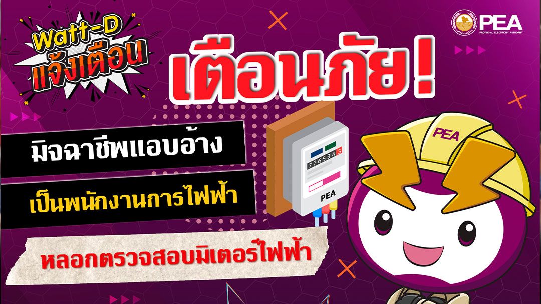การไฟฟ้าส่วนภูมิภาค (PEA) แจ้งเตือนประชาชนให้ระมัดระวังกลุ่มมิจฉาชีพแอบอ้างเป็นเจ้าหน้าที่การไฟฟ้าส่วนภูมิภาค ขอตรวจสอบหรือสับเปลี่ยนมิเตอร์ไฟฟ้า