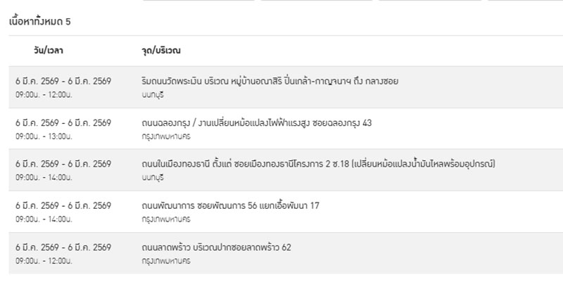 วันที่ 5 มีนาคม 2569 การไฟฟ้านครหลวง (กฟน.) แจ้งประกาศการ “ดับไฟ” ชั่วคราว ในบางพื้นที่ของกรุงเทพมหานคร สและนนทบุรี ในวันศุกร์ที่ 6 มีนาคม 2569 เพื่อพัฒนาหรือบำรุงรักษาระบบการจ่ายกระแสไฟฟ้าให้มีประสิทธิภาพยิ่งขึ้นใน 5 จุด ดังต่อไปนี้
