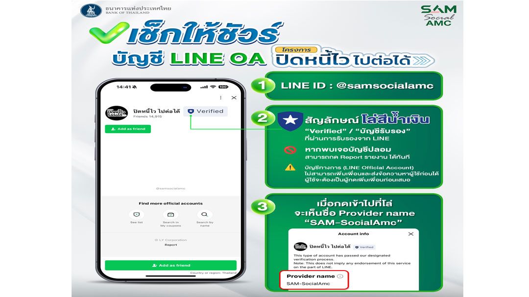 ทั้งนี้ ลูกค้าที่ผ่านคุณสมบัติเข้าโครงการฯ จะต้องยืนยันตัวตนผ่านช่องทาง LINE Official Account @samsocialamc โดยกรอกข้อมูลตามที่กำหนดให้ครบถ้วน และ SAM ขอให้ความเชื่อมั่นว่ากระบวนการแสดงตนของลูกค้าในโครงการ "ปิดหนี้ไว ไปต่อได้" ผ่านช่องทาง Line Official Account@samsocialamc มีความน่าเชื่อถือ ปลอดภัย อยู่ภายใต้มาตรฐานและสอดคล้องกับประกาศสำนักงาน ปปง. เรื่องแนวทางในการระบุตัวตนและพิสูจน์ทราบตัวตนของลูกค้า