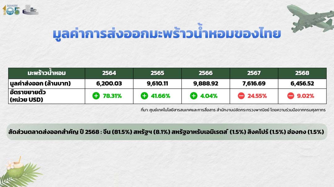 ‘กรมพัฒนาธุรกิจการค้า’แจงรายละเอียดห่วงโซ่อุปทาน‘มะพร้าวน้ำหอมไทย’ ส่งผลราคาผันผวนหนัก เปิดแนวทางการแก้ปัญหาระยะสั้น-กลาง กระตุ้นราคาอยู่เหนือจุดคุ้มทุน เร่งรักษาตลาดส่งออกเดิม เพิ่มตลาดใหม่ ฟื้นฟูตลาดเก่า ลดการผูกขาด