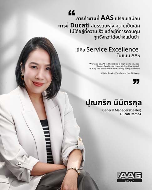 “การทำงานที่ AAS ก็เหมือนการขี่ Ducati สมรรถนะสูงพลังพาเราไปข้างหน้า แต่ความเป็นเลิศที่แท้จริง อยู่ที่การเข้าโค้งทุกจังหวะอย่างแม่นยำ มั่นใจ และสง่างาม เพราะความเป็นผู้นำ ไม่ได้วัดกันที่ความเร็ว แต่คือการควบคุมทุกจังหวะได้อย่างสมบูรณ์แบบ นั่นคือ Service Excellence ในแบบ AAS”