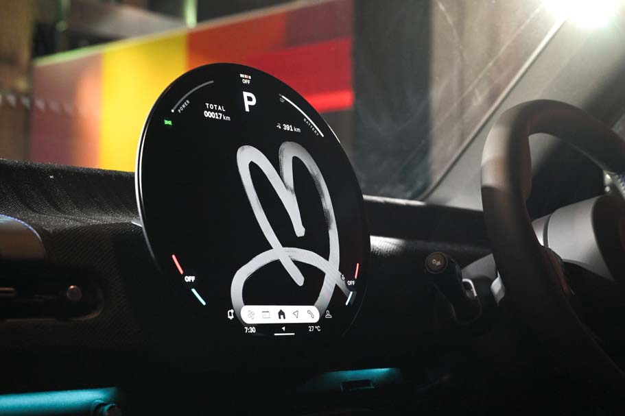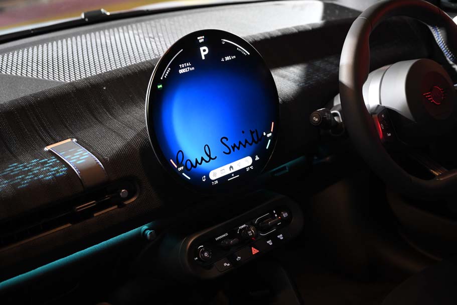 หน้าจอแสดงผลทรงกลมบริเวณกลางคอนโซล มาพร้อมภาพแบ็คกราวด์ลายพอล สมิธ ให้เลือกใช้ได้ 3 ภาพในโหมด Personal และเมื่อเปิดประตูรถ ผู้ขับขี่และผู้โดยสารเบาะหน้าจะได้รับการต้อนรับด้วยไฟโปรเจกเตอร์ที่ฉายคำว่า 'Hello' ในรูปแบบลายมือลงที่พื้น ส่วนกรอบประตูรถด้านล่างก็ยังตกแต่งด้วยข้อความ ‘Every day is a new beginning’ ซึ่งเป็นคติประจำใจของพอล สมิธ ขณะที่พรมปูพื้นในห้องโดยสารมาพร้อมกับกราฟิกรูปกระต่าย จากฝีมือการวาดของเซอร์ พอล สมิธ อีกด้วย