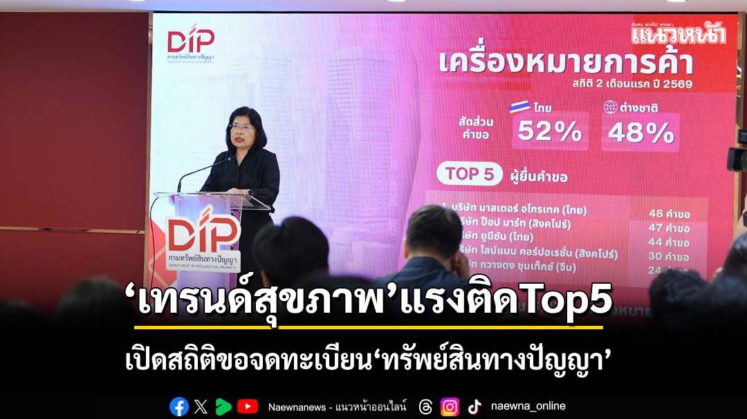 ‘กรมทรัพย์สินทางปัญญา’เผยสถิติขอจดทะเบียน/แจ้งข้อมูลทรัพย์สินทางปัญญาในไทย 2 เดือนแรกปี 2569 ยอดรวมกว่า 14,394 คำขอ ‘เทรนด์สุขภาพ’ยังพุ่งแรง ติด Top5 คำขอ IP หลายประเภท