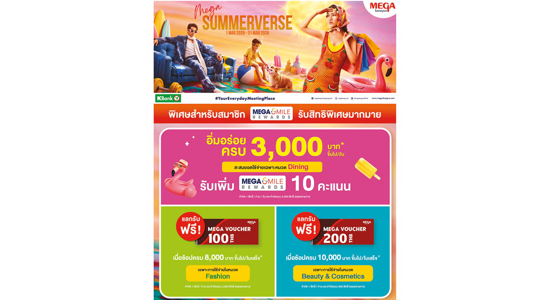 จัดแคมเปญ “MEGA SUMMERVERSE”ตั้งแต่วันนี้ถึง 31 มีนาคม 2569 ที่ศูนย์การค้าเมกาบางนา มอบสิทธิพิเศษสำหรับสมาชิกเมกา สไมล์ รีวอร์ดส อิ่มอร่อยครบ 3,000 บาทขึ้นไป/วัน สะสมยอดใช้จ่ายในหมวด DINING รับเพิ่ม! คะแนน เมกา สไมล์ รีวอร์ดส 10 คะแนน แลกรับฟรี! MEGA VOUCHER มูลค่า 100 บาท เมื่อช้อปครบ 8,000 บาทขึ้นไป/ใบเสร็จ เฉพาะการใช้จ่ายในหมวดแฟชั่น แลกรับฟรี! MEGA VOUCHER มูลค่า 200 บาท เมื่อช้อปครบ 10,000 บาทขึ้นไป/ใบเสร็จ เฉพาะการใช้จ่ายในหมวด BEAUTY & COSMETICS พร้อมยกระดับสิทธิพิเศษสำหรับผู้ถือบัตรเครดิตวีซ่ากสิกรไทยไปกับแคมเปญ “กิน-ช้อป คุ้ม X4 ที่เมกาบางนา” คุ้ม 1 รับส่วนลดสูงสุด 60% คุ้ม 2 รับฟรี MEGA VOUCHER มูลค่า 100 บาท หรือรับฟรี MEGA VOUCHER มูลค่า 300 บาท คุ้ม 3 รับเครดิตเงินคืนสูงสุด 15% และคุ้ม 4 วันเสาร์-อาทิตย์ รับฟรี! ขนมหรือเครื่องดื่ม