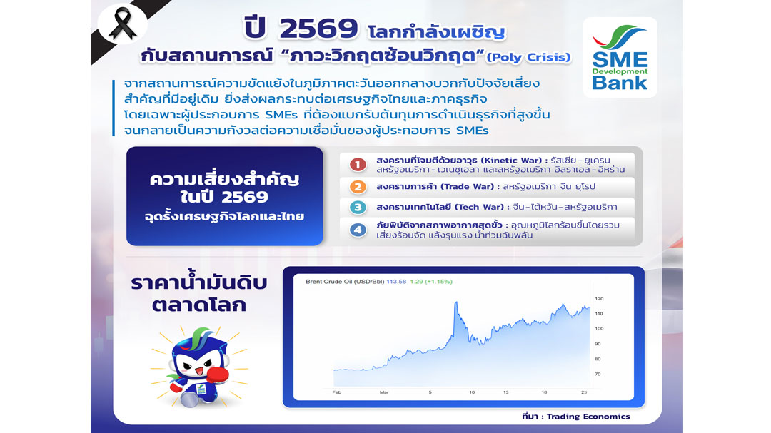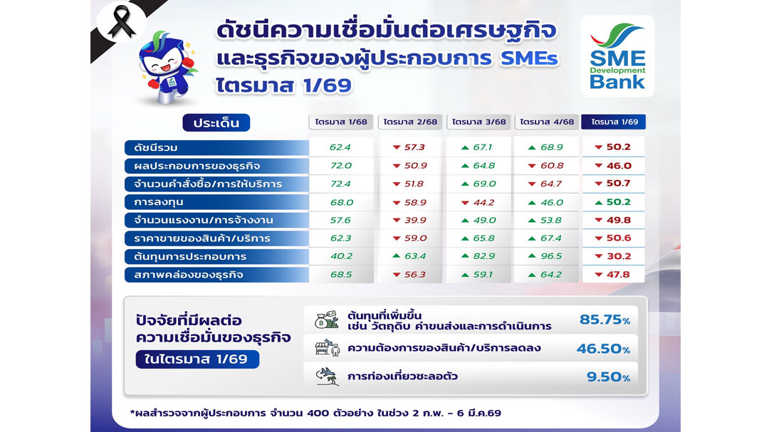 นายพิชิต มิทราวงศ์ กรรมการผู้จัดการ ธนาคารพัฒนาวิสาหกิจขนาดกลางและขนาดย่อมแห่งประเทศไทย (ธพว.) หรือ SME D Bank เปิดเผยว่า SME D Bank โดย “ศูนย์วิจัยและข้อมูล ธพว.” ร่วมกับ สำนักวิจัยเศรษฐกิจและประเมินผล บริษัท เอ็กเซลเลนท์ บิสเนส แมเนจเม้นท์ จำกัด ทำการสำรวจ “ดัชนีความเชื่อมั่นของผู้ประกอบการเอสเอ็มอีต่อเศรษฐกิจและธุรกิจ ในไตรมาสที่ 1/2569 และคาดการณ์อนาคต” จากกลุ่มผู้ประกอบการเอสเอ็มอีทั่วประเทศ ครอบคลุมทุกประเภทอุตสาหกรรม จำนวน 400 ตัวอย่าง พบว่า ดัชนีความเชื่อมั่นรวมของผู้ประกอบการเอสเอ็มอี ประจำไตรมาส 1/69 อยู่ที่ระดับ 50.2 ลดลงจากไตรมาส 4/68 ที่อยู่ระดับ 68.9 เนื่องจากมีความกังวลต่อระดับราคาน้ำมันในประเทศที่จะปรับตัวสูงขึ้นจากผลกระทบของสงครามสหรัฐฯ กับอิหร่าน ส่งผลเชิงลบด้านต้นทุนการประกอบการ เช่น วัตถุดิบ ค่าขนส่งการดำเนินงาน รวมถึงผลกระทบต่อความเชื่อมั่นด้านคำสั่งซื้อ/บริการ ผลประกอบการที่ปรับลดลง และการท่องเที่ยวที่ชะลอตัว