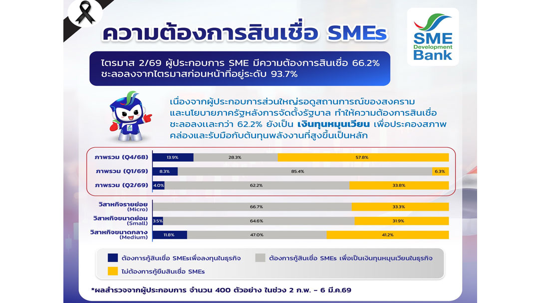 ขณะที่ คาดการณ์ 3 เดือนข้างหน้า หรือไตรมาส 2/69 ผู้ประกอบการเอสเอ็มอี มีความต้องการสินเชื่อ 66.2% ชะลอลงจากไตรมาสก่อนหน้าที่อยู่ระดับ 93.7% เนื่องจากผู้ประกอบการส่วนใหญ่รอดูสถานการณ์ของสงคราม และนโยบายภาครัฐหลังการจัดตั้งรัฐบาล ทำให้ความต้องการสินเชื่อของเอสเอ็มอีกว่า 62.2% ยังเป็นเงินทุนหมุนเวียน เพื่อประคองสภาพคล่องและรับมือกับต้นทุนพลังงานที่สูงขึ้นเป็นหลัก