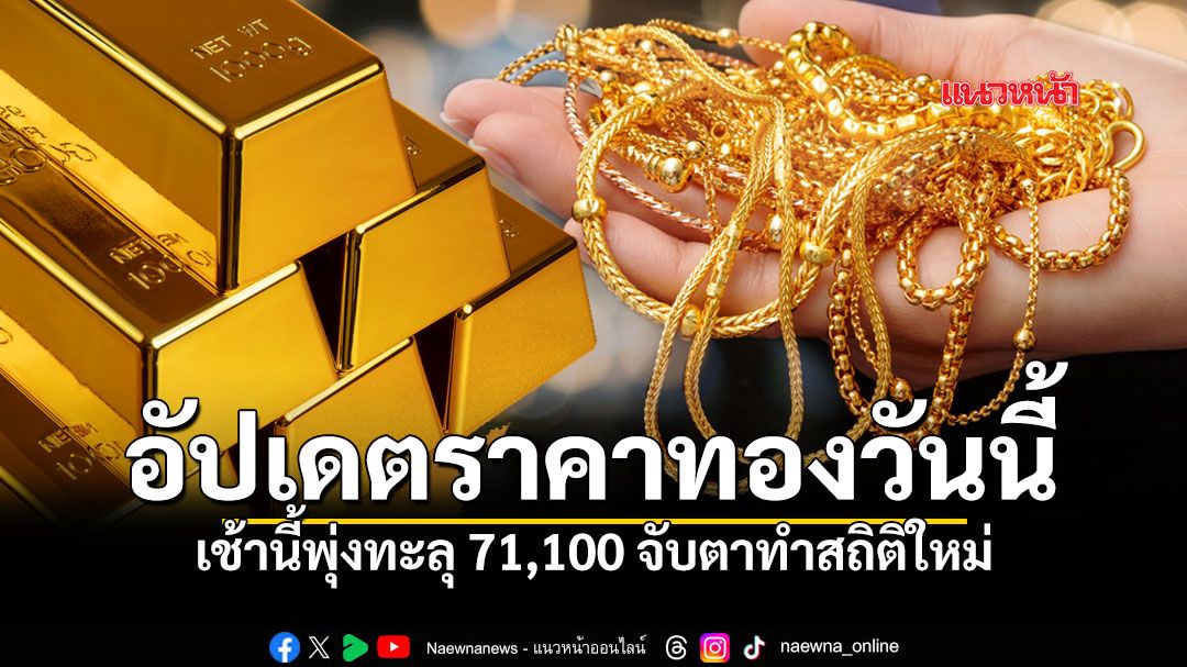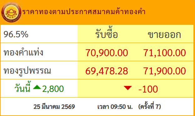 สมาคมค้าทองคำ เปิดตลาดราคาทองคำ วันที่ 25 มีนาคม 2569 โดยเมื่อเวลา 09.50 น. มีการปรับราคาครั้งที่ 7 โดยสรุปราคา ทองคำแท่ง รับซื้อ 70,900.00 ขายออก 71,100.00 ทองรูปพรรณ รับซื้อ 69,478.28 ขายออก 71,900.00