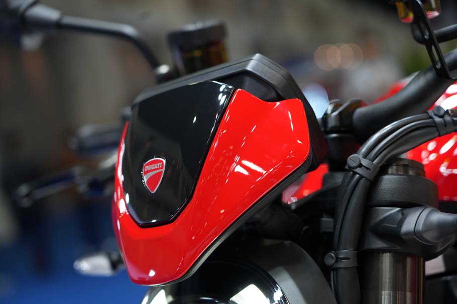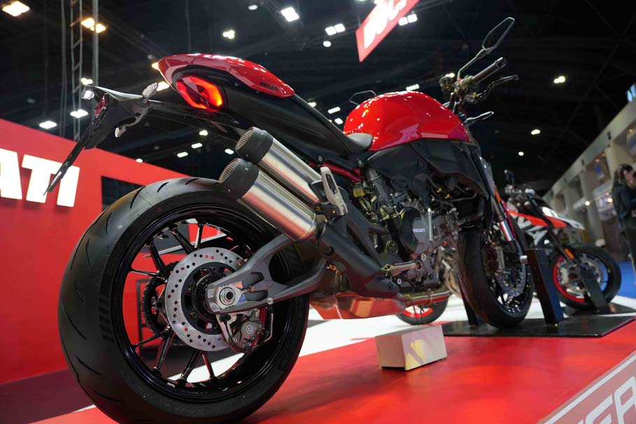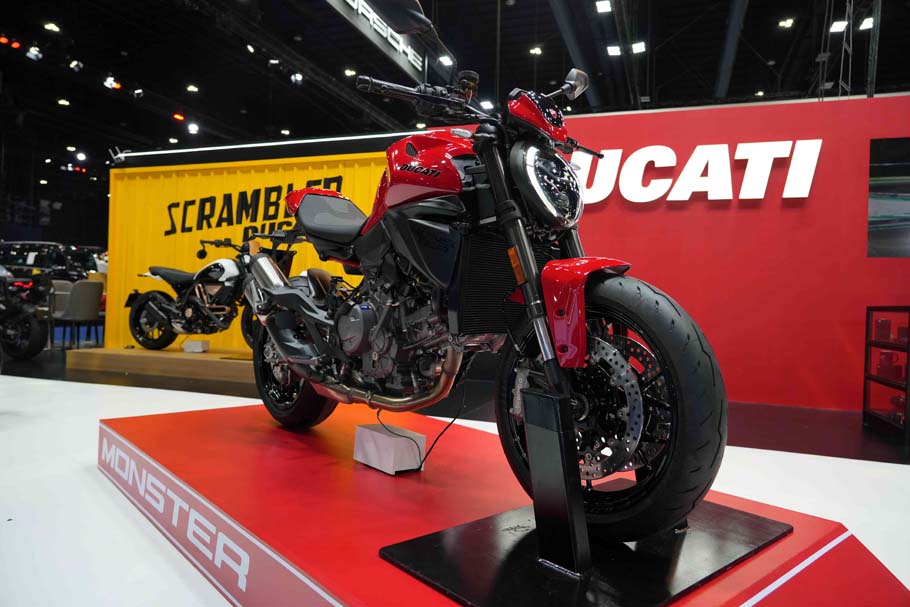 ไฮไลท์สำคัญของบูธปีนี้คือ New Monster+ (มอนเสตอร์ พลัส) สปอร์ตเน็กเก็ตไบค์ระดับไอคอน ที่กลับมาภายใต้แนวคิด “Everything you need, nothing more” ถ่ายทอดปรัชญาการออกแบบที่ตัดทอนสิ่งไม่จำเป็น เหลือไว้เพียง “แก่นแท้ของความสนุกในการขับขี่” มาพร้อมเครื่องยนต์ Ducati V2 รุ่นใหม่ ให้สมรรถนะ 111 แรงม้า 890 ซีซี โครงสร้างน้ำหนักเบาเพียง 175 กิโลกรัม และเทคโนโลยีอิเล็กทรอนิกส์ครบครัน ทั้ง Riding Modes, Traction Control, Wheelie Control, Quick Shift 2.0 และครั้งแรกสำหรับ Monster ที่มี Engine Brake control (EBC) พร้อมดีไซน์ใหม่ที่ยังคงเอกลักษณ์ Monster อย่างชัดเจน