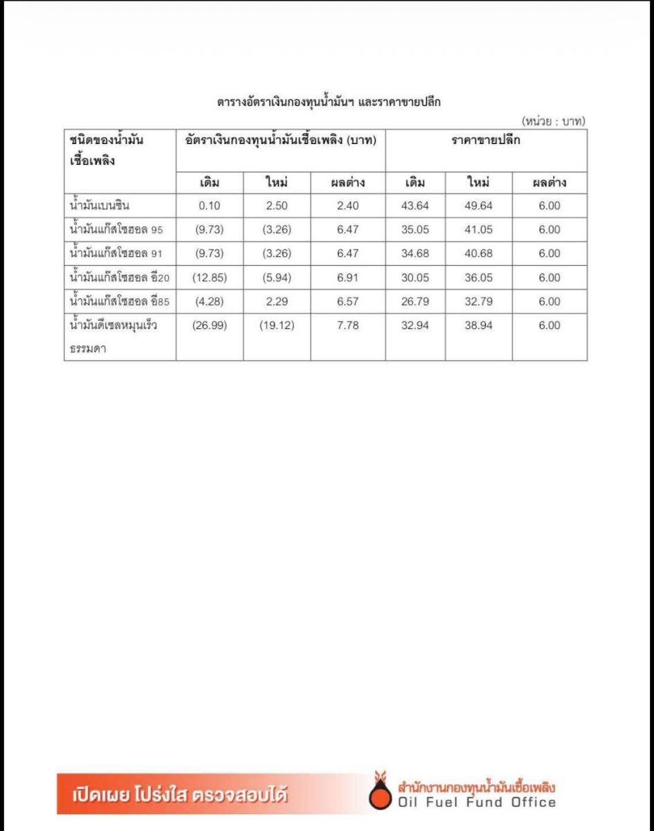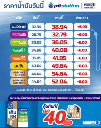 เมื่อวันที่ 25 มีนาคม 2569 คณะกรรมการบริหารกองทุนน้ำมันเชื้อเพลิง (กบน.) มีมติเห็นชอบในการปรับลดอัตราชดเชยราคาน้ำมันดีเซลและกลุ่มเบนซิน ทำให้ราคาขายปลีกน้ำมันทุกชนิด ในวันพรุ่งนี้ (26 มีนาคม 2569) จะปรับขึ้น 6 บาทต่อลิตร ซึ่งการปรับราคาเป็นผลมาจากสถานการณ์ความตึงเครียดในตะวันออกกลาง ส่งผลให้ระดับราคาน้ำมันมีการปรับตัวสูงขึ้นอย่างต่อเนื่อง และทำให้ราคาน้ำมันดีเซลในตลาดสิงคโปร์ดีดตัวสูงขึ้นอย่างรุนแรง จาก 198.20 เหรียญสหรัฐต่อบาร์เรลในวันที่ 23 มีนาคม 2569 พุ่งสูงถึง 242.91 เหรียญสหรัฐต่อบาร์เรลในวันที่ 23 มีนาคม 2569