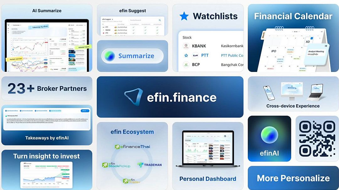 efin group ผู้นำด้านเทคโนโลยีข้อมูลการลงทุนของไทย ประกาศเปิดตัว “efin.finance” แพลตฟอร์ม Investment Intelligence รูปแบบใหม่ที่นำเทคโนโลยี Artificial Intelligence (AI) มาใช้สรุปและวิเคราะห์ข้อมูลตลาดทุนแบบครบวงจร มุ่งแก้ปัญหาข้อมูลล้นตลาด (Data Overload) และช่วยให้นักลงทุนเข้าถึง Insight สำคัญได้อย่างรวดเร็วและแม่นยำ