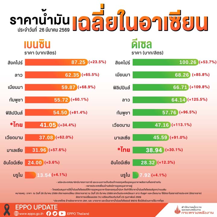 ขณะที่ราคาน้ำมันดีเซลของไทยอยู่ที่ 38.94 บาทต่อลิตร และเมื่อเปรียบเทียบราคาน้ำมันดีเซลกับประเทศอื่นๆ ในกลุ่มอาเซียน อาทิ สิงคโปร์ 100.26 บาท ฟิลิปปินส์ 68.26 บาท ลาว 64.14 บาท เวียดนาม 47.16 บาท ราคาขายของไทยยังคงถือว่าอยู่ในระดับที่ค่อนข้างต่ำ