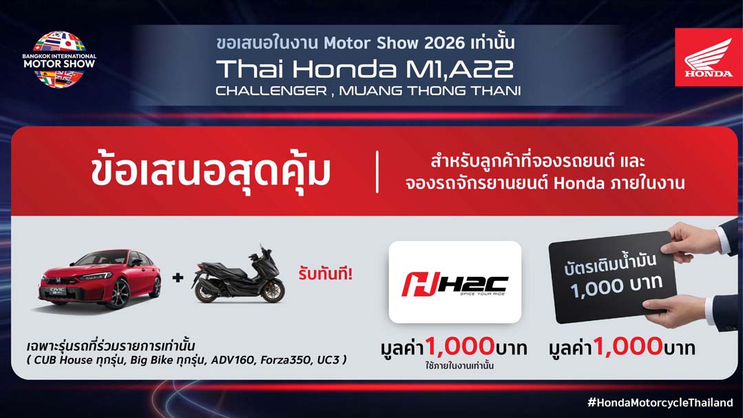 ไม่เพียงเท่านี้ ยังมีข้อเสนอสุดคุ้มสำหรับลูกค้าที่จองทั้งรถยนต์และรถจักรยานยนต์ Honda* ภายในงาน รับทันทีบัตรส่วนลด H2C มูลค่า 1,000 บาท สำหรับใช้ภายในงาน และบัตรเติมน้ำมันมูลค่า 1,000 บาท (ตามเงื่อนไขที่บริษัทฯ กำหนด) ภายในบูธฮอนด้า ยังมีการจัดแสดงรถจักรยานยนต์รุ่นใหม่และรุ่นยอดนิยม พร้อมข้อเสนอพิเศษเพิ่มเติม เพื่อให้ลูกค้าได้สัมผัสไลฟ์สไตล์การเดินทางอย่างครบวงจร