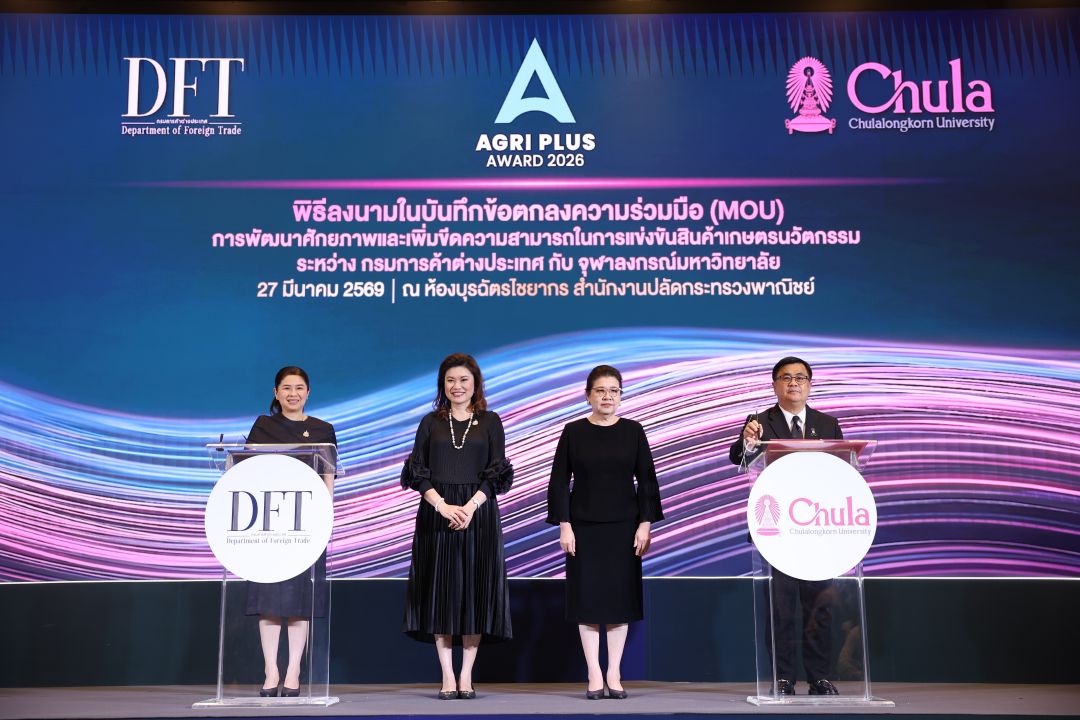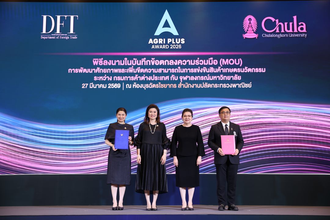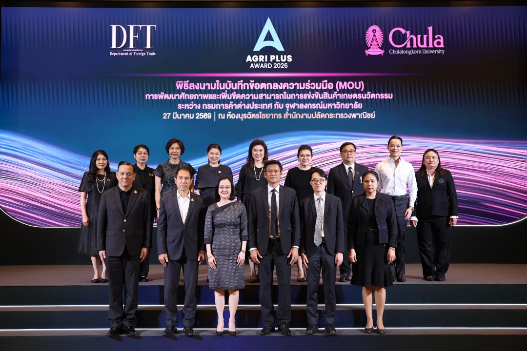 กรมการค้าต่างประเทศ กระทรวงพาณิชย์ เปิดเวทีการประกวด Agri Plus Award 2026 เฟ้นหาสุดยอดสินค้าเกษตรนวัตกรรมไทยสร้างมูลค่าเพิ่มสู่ตลาดโลก ชิงถ้วยพระราชทานอันทรงเกียรติจากสมเด็จพระกนิษฐาธิราชเจ้ากรมสมเด็จพระเทพรัตนราชสุดาฯ สยามบรมราชกุมารี เปิดโอกาสให้เจ้าของผลิตภัณฑ์ นิสิต นักศึกษา นักวิจัย และคนรุ่นใหม่ทั่วประเทศได้โชว์ไอเดีย พลิกโฉมสินค้าเกษตรไทยให้ก้าวไกลระดับสากล โดยในปีนี้ กรมฯ ได้รับเกียรติจากผู้ช่วยรัฐมนตรีประจำกระทรวงพาณิชย์ (ดร. กิริฎา เภาพิจิตร) ให้เกียรติมาเป็นประธานในพิธี และเป็นสักขีพยานในการลงนาม MOU ระหว่างกรมการค้าต่างประเทศและจุฬาลงกรณ์มหาวิทยาลัย ร่วมปั้น SMEs สินค้าเกษตรนวัตกรรมไทย ก้าวไกลสู่อินเตอร์