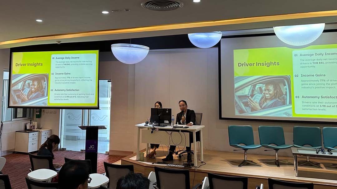 ผศ.ดร.สุทธิกร กิ่งแก้ว ผู้บริหารโครงการวิจัย เปิดเผยผลสำรวจว่า ประชากรในเมืองกว่า 80% นิยมใช้ระบบเรียกรถผ่านแอปฯ และกว่า 70% ใช้เป็นประจำทุกอาทิตย์ ทั้งนี้เพราะความสะดวก อย่างไรก็ตาม ผู้ใช้บริการยังกังวลเรื่องความปลอดภัย ปัญหาการขาดแคลนรถ และราคาที่พุ่งสูงในช่วงชั่วโมงเร่งด่วน ขณะที่ฝั่งผู้ขับขี่พบว่ามีรายได้สุทธิเฉลี่ย 850 บาทต่อวัน ซึ่งสูงกว่าอาชีพเดิมและต่างพอใจในความอิสระของการทำงาน แต่ยังมีความกังวลเรื่องสัดส่วนการหักค่าคอมมิชชันที่เป็นสัดส่วนสำคัญของค่าโดยสาร และการเพิ่มขึ้นของค่าครองชีพทำให้ต้องเพิ่มชั่วโมงทำงาน ซึ่งอาจกระทบต่อคุณภาพบริการในระยะยาว ในด้านการกำกับดูแล ภาครัฐได้ให้การรับรองธุรกิจนี้ตั้งแต่ปี 2564 และล่าสุด คณะกรรมการธุรกรรมทางอิเล็กทรอนิกส์ (ETDA) เตรียมบังคับใช้ประกาศฉบับใหม่ในวันที่ 31 มีนาคม 2569 เพื่อยกระดับความปลอดภัย เช่น การตรวจสอบเรื่องใบขับขี่สาธารณะของผู้ขับขี่ การเชื่อมโยงข้อมูลกับแอปพลิเคชัน ThaiD เป็นต้น