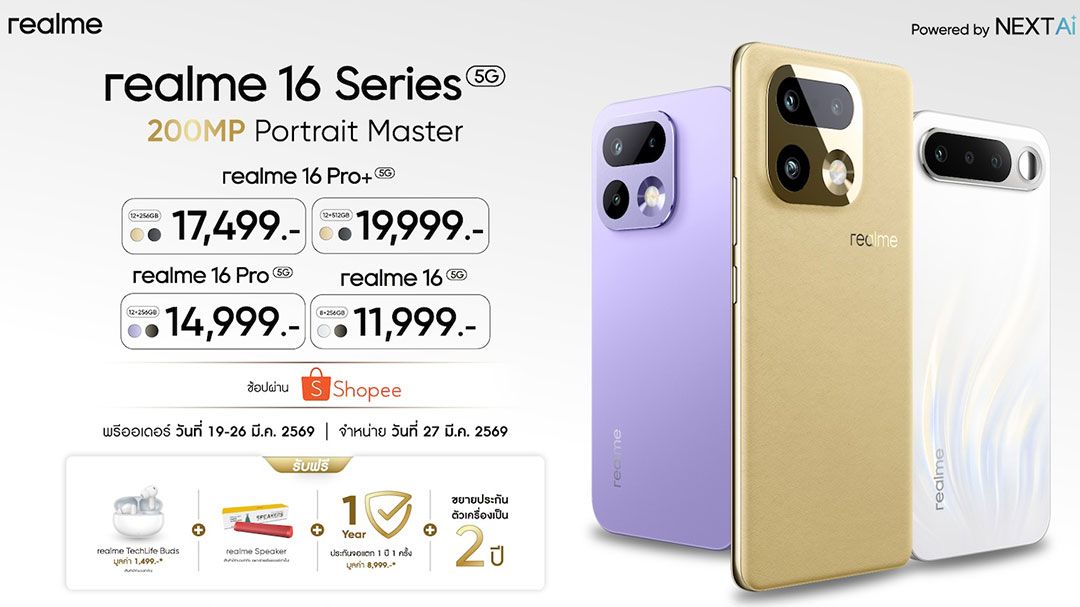 • realme 16 Pro+ 5G ความจุ 12/256GB ราคาเริ่มต้น 11,499 บาท และความจุ 12/512GB ราคาเริ่มต้น 13,999 บาท