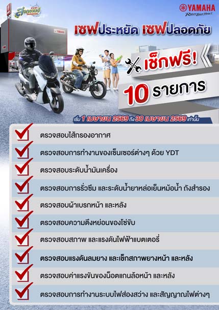 บริษัท ไทยยามาฮ่ามอเตอร์ จำกัด ร่วมกับผู้จำหน่ายรถจักรยานยนต์ยามาฮ่าทั่วประเทศ จัดแคมเปญพิเศษ “Songkran Safe & Save 2569” เพื่อส่งมอบความห่วงใยให้กับลูกค้ายามาฮ่า ในช่วงเทศกาลสงกรานต์ สนับสนุนการขับขี่ปลอดภัย สอดคล้องกับแนวทางของกรมการขนส่งทางบก ในโครงการ “ตรวจรถก่อนใช้ เดินทางปลอดภัย” พร้อมมอบโปรโมชันสุดคุ้ม “เซฟปลอดภัย เซฟประหยัด” ให้ลูกค้าเตรียมความพร้อมของรถจักรยานยนต์ก่อนออกเดินทาง
