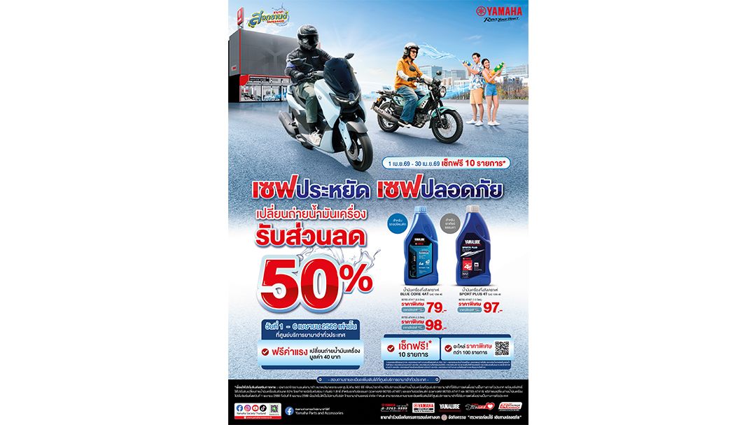 โดยลูกค้าสามารถเข้ารับบริการเปลี่ยนถ่ายน้ำมันเครื่อง YAMALUBE ที่ร่วมรายการ รับส่วนลดสูงสุด 50% พร้อมฟรีค่าแรง ระหว่างวันที่ 1 – 6 เมษายน 2569 เท่านั้น ที่ศูนย์บริการยามาฮ่าที่ได้รับการแต่งตั้งอย่างเป็นทางการทั่วประเทศ