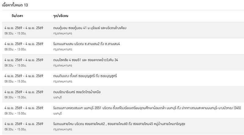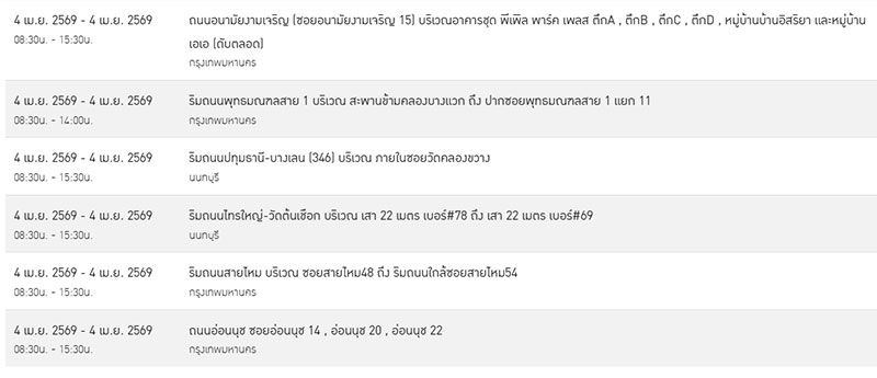 วันที่ 3 เมษายน 2569 การไฟฟ้านครหลวง (กฟน.) ประกาศเรื่อง มีความจำเป็นต้อง “ดับไฟ” ในพื้นที่กรุงเทพมหานคร และ นนทบุรี ในวันเสาร์ที่ 4 เมษายน 2569 เพื่อพัฒนาหรือบำรุงรักษาระบบการจ่ายกระแสไฟฟ้าให้มีประสิทธิภาพยิ่งขึ้น ทั้งนี้ เพื่อให้เกิดความปลอดภัยในการปฏิบัติงาน กฟน. จึงจำเป็นต้องงดจ่ายกระแสไฟเป็นการชั่วคราวให้กับบริเวณพื้นที่จำนวนทั้งหมด 13 จุด ในพื้นที่ดังต่อไปนี้