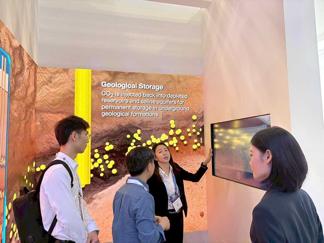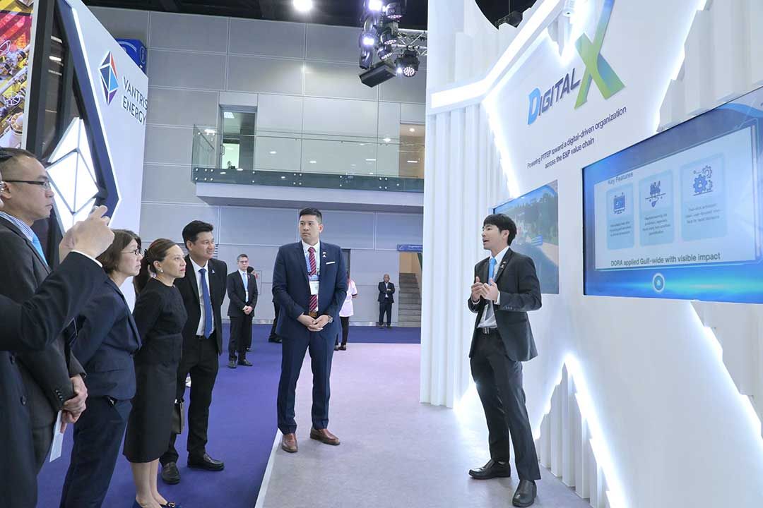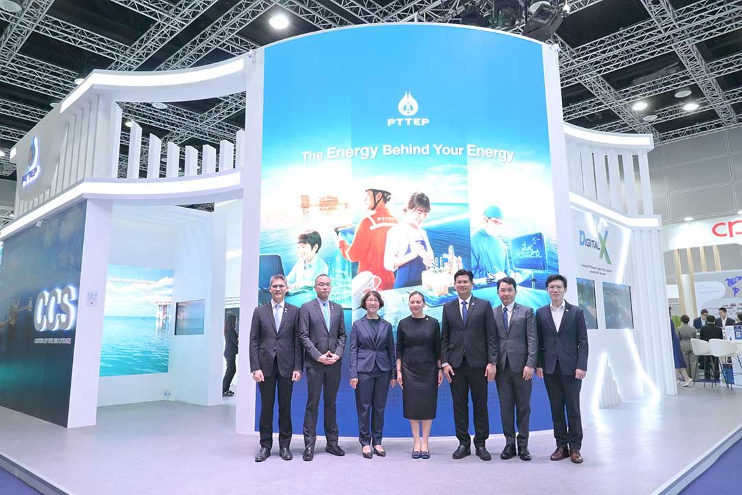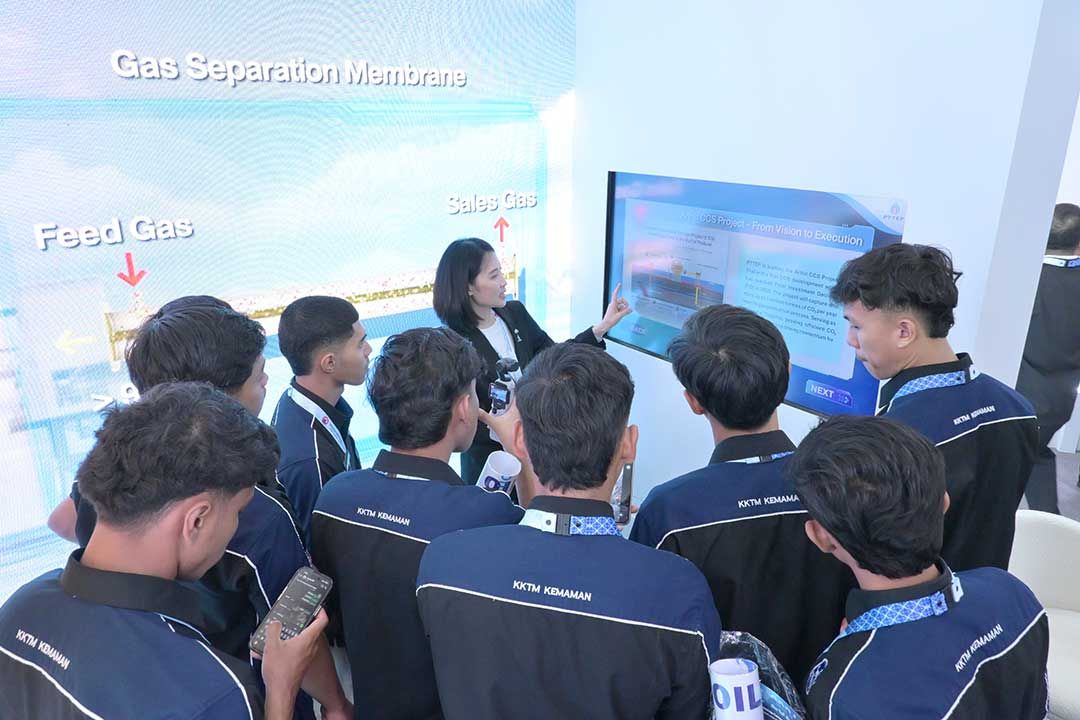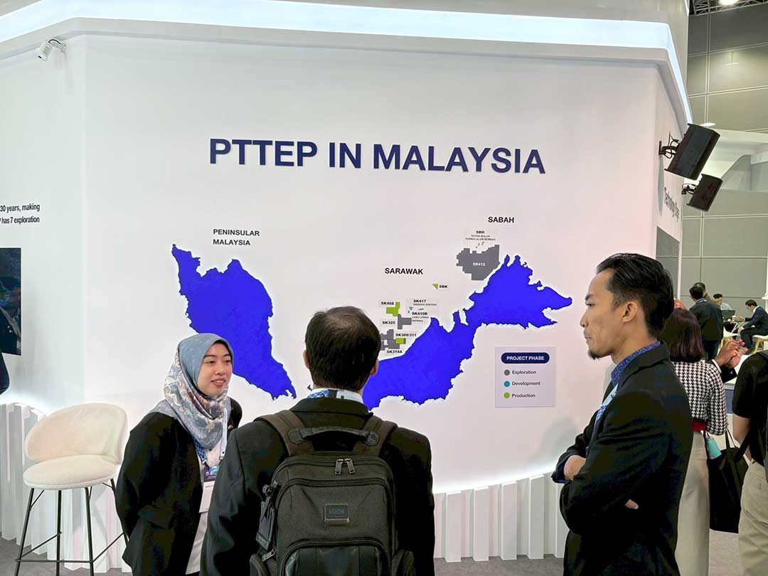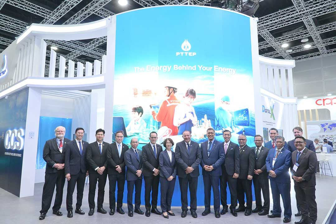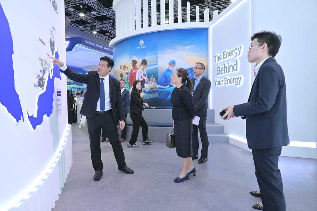ในโอกาสนี้ นางสาวลดา ภู่มาศ เอกอัครราชทูต ณ กรุงกัวลาลัมเปอร์ ประเทศมาเลเซีย ได้ให้เกียรติเยี่ยมชมบูธนิทรรศการของ ปตท.สผ. ที่จัดแสดงเกี่ยวกับการดำเนินงานและยุทธศาสตร์การเติบโตของบริษัทซึ่งมีโครงการสำรวจและผลิตปิโตรเลียมกว่า 50 แห่ง ในกว่า 10 ประเทศ โดยเฉพาะในประเทศมาเลเซียซึ่งเป็นหนึ่งในฐานการลงทุนที่สำคัญของบริษัท รวมทั้งนำเสนอโครงการดักจับและกักเก็บก๊าซคาร์บอนไดออกไซด์ (Carbon Capture and Storage หรือ CCS) ที่แหล่งอาทิตย์ในอ่าวไทย ซึ่งจะช่วยลดการปล่อยก๊าซเรือนกระจกจากกระบวนการผลิตปิโตรเลียมและสนับสนุนเป้าหมายการปล่อยก๊าซเรือนกระจกสุทธิเป็นศูนย์อย่างเป็นรูปธรรม นอกจากนี้ ยังจัดแสดงนวัตกรรมดิจิทัลภายใต้โครงการ DigitalX ซึ่งช่วยสนับสนุนกระบวนการสำรวจและผลิตปิโตรเลียม เช่น DORA (Drilling Operation Real-Time Analyses) ระบบการวิเคราะห์การเจาะหลุมปิโตรเลียมแบบเรียลไทม์ และ IOCC (Integrated Operations Control Center) ศูนย์ควบคุมการปฏิบัติงานที่เชื่อมโยงข้อมูลการผลิตจากแหล่งก๊าซธรรมชาติในอ่าวไทย โดยเทคโนโลยีดังกล่าวจะช่วยยกระดับและเพิ่มประสิทธิภาพ ลดระยะเวลาและค่าใช้จ่าย รวมทั้งเพิ่มความปลอดภัยในการดำเนินงานอีกด้วย