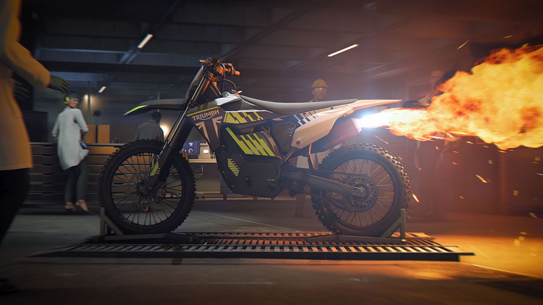 สามารถชมการใช้งานรถจักรยานยนต์โมโตครอสไทรอัมพ์คัสตอมพิเศษที่ติดตั้งอุปกรณ์พ่นไฟในตัวอย่างทางการของเกม 007 First Light - Announcement Trailer.