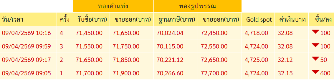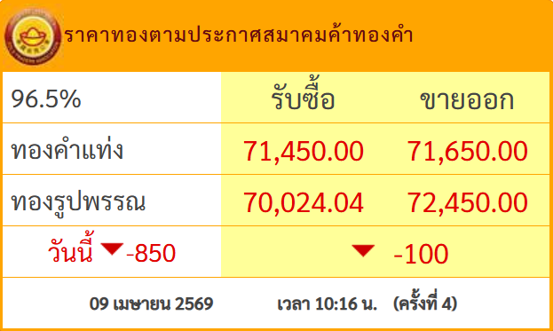 9 เมษายน 2569 ราคาทองตามประกาศสมาคมค้าทองคำ รายงานราคาทองเช้าวันนี้ เมื่อเวลา 10.16 น. โดย ทองคำแท่ง รับซื้อ 71,450.00 ขายออก 71,650.00 ทองรูปพรรณ รับซื้อ 70,024.04 ขายออก 72,450.00