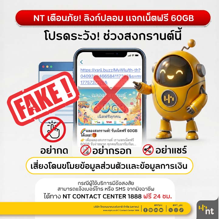บริษัท โทรคมนาคมแห่งชาติ จำกัด (มหาชน) หรือ NT แจ้งเตือนผู้ใช้บริการมือถือทุกเครือข่าย ระวังมิจฉาชีพแอบอ้างชื่อผู้ให้บริการเครือข่ายโทรคมนาคม ชักชวนรับอินเทอร์เน็ตฟรี 60GB ผ่านลิงก์บนสื่อสังคมออนไลน์ในช่วงเทศกาลสงกรานต์