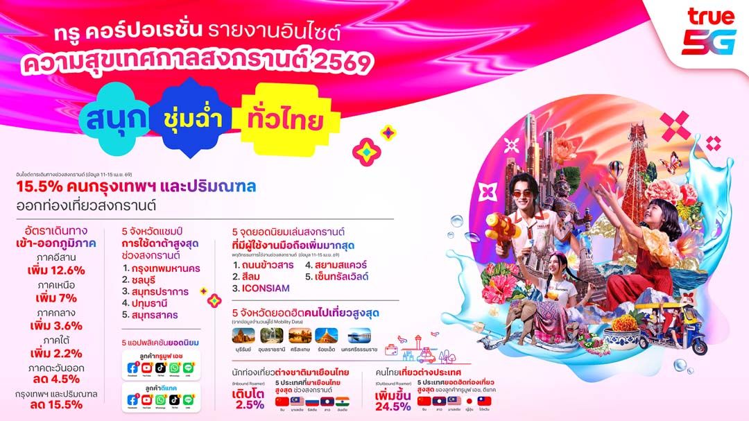 16 เมษายน 2569 ทรู คอร์ปอเรชั่น เผยอินไซต์ “ความสุขเทศกาลสงกรานต์ 2569” ผ่านการวิเคราะห์ข้อมูล “Mobility Data” จากโครงข่ายอัจฉริยะที่ขับเคลื่อนด้วย AI สะท้อนพฤติกรรมการเดินทางและการใช้งานดิจิทัลของผู้บริโภคแบบเรียลไทม์ พบว่าเทศกาลปีนี้มีการเดินทางกระจายตัวมากขึ้นทั่วประเทศ โดยเฉพาะภูมิภาคอีสานที่เติบโตสูงสุด ขณะที่นักท่องเที่ยวต่างชาติยังคงเพิ่มขึ้นต่อเนื่อง โดยเฉพาะนักท่องเที่ยวจีนที่ครองอันดับหนึ่ง