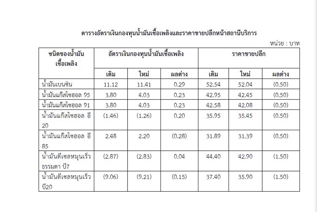 น้ำมันแก๊สโซฮอล์ อี20 ปรับลดอัตราเงินกองทุน 0.20 บาทต่อลิตร เป็นชดเชย 1.26 บาทต่อลิตร ส่งผลให้ราคาขายปลีกลดลง 0.50 บาทต่อลิตร เป็น 35.45 บาทต่อลิตร