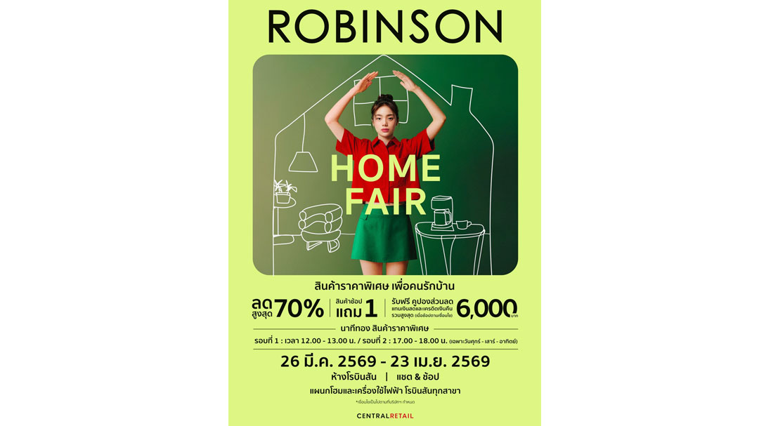 จัดแคมเปญ “ROBINSON HOME FAIR” เอาใจคนรักบ้าน ชวนช้อปไอเทมแต่งบ้านและเครื่องใช้ภายในบ้านที่คัดสรรมาอย่างครบครัน ตั้งแต่วันนี้ถึง 23 เมษายน 2569 ที่ห้างสรรพสินค้าโรบินสันทุกสาขา กับข้อเสนอสุดคุ้มมากมาย สินค้าราคาพิเศษ ลดสูงสุด 70% ,สินค้าช้อป 1 แถม 1 (เฉพาะรุ่นที่ร่วมรายการ), สินค้านาทีทอง (เฉพาะวันเสาร์ อาทิตย์) ,รับฟรี! คูปองส่วนลดแทนเงินสดและเครดิตเงินคืน รวมสูงสุด 6,000 บาท เมื่อช้อปตามเงื่อนไข นอกจากนี้ยังเพิ่มความคุ้ม! ให้ลุ้นอีกต่อกับแคมเปญ “ROBINSON แลก ลุ้น รถ” แจกหนัก จัดใหญ่ ตั้งแต่วันนี้ถึง 31 พฤษภาคม 2569 แลกคะแนนเดอะวัน ลุ้นรับรางวัลใหญ่ รางวัลที่ 1 รถยนต์ Chery V23 2WD PLUS มูลค่า 759,900 บาท 1 รางวัล ,รางวัลที่ 2 Dyson เครื่องฟอกอากาศแบบตั้งพื้น TP10 มูลค่า 15,900 บาท 4 รางวัล ,รางวัลที่ 3 บัตรของขวัญโรบินสัน มูลค่า 10,000 บาท 5 รางวัล