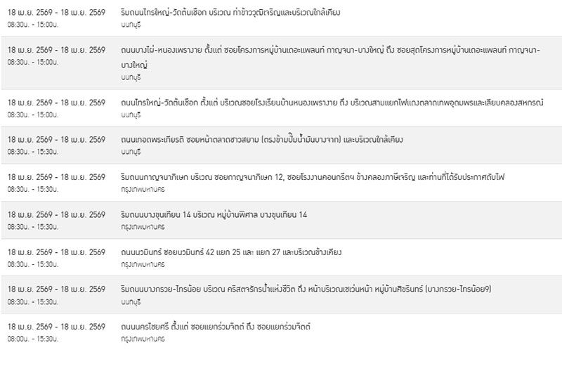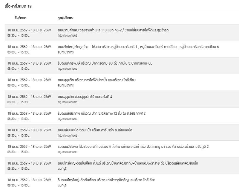 ทั้งนี้ เพื่อให้เกิดความปลอดภัยในการปฏิบัติงาน กฟน. จึงจำเป็นต้องงดจ่ายกระแสไฟเป็นการชั่วคราวให้กับบริเวณพื้นที่จำนวนทั้งหมด 18 จุด ในพื้นที่ดังต่อไปนี้