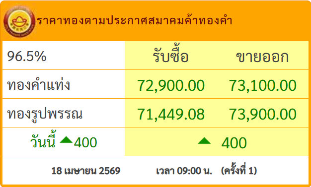 18 เมษายน 2569 ราคาทองตามประกาศสมาคมค้าทองคำ รายงานราคาทองเช้าวันนี้ เมื่อเวลา 09.00 น. โดย ทองคำแท่ง รับซื้อ 72,900.00 ขายออก 73,100.00 ทองรูปพรรณ รับซื้อ 71,449.08 ขายออก 73,900.00
