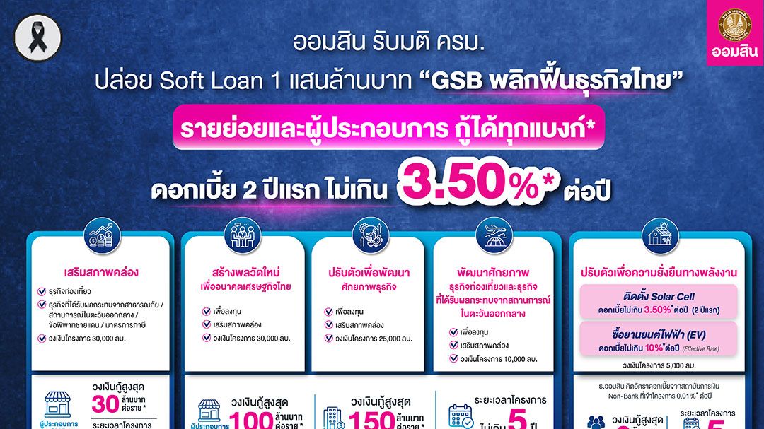 โครงการสินเชื่อดอกเบี้ยต่ำ (Soft Loan) “GSB พลิกฟื้นธุรกิจไทย” วงเงินโครงการรวม 100,000 ล้านบาท ธนาคารออมสินให้วงเงินสินเชื่อดอกเบี้ยต่ำมากแก่สถาบันการเงินและผู้ให้บริการทางการเงินอื่น ๆ ที่ไม่ใช่สถาบันการเงิน (Non – Bank) ที่เข้าร่วมโครงการ เพื่อให้ทุกรายนำวงเงินสินเชื่อนั้นไปปล่อยกู้ต่อให้กับลูกค้ารายย่อย ผู้ประกอบการ SMEs และธุรกิจขนาดใหญ่ ในอัตราดอกเบี้ย 2 ปีแรก ไม่เกิน 3.50% ต่อปี โดยเป็นไปตามโปรแกรมและเงื่อนไขที่แต่ละธนาคารกำหนด (*ยกเว้นการกู้ซื้อรถ EV) ใน 3 วัตถุประสงค์หลัก คือ 1) สินเชื่อเพื่อเสริมสภาพคล่อง 2) สินเชื่อเพื่อขยายธุรกิจ สำหรับผู้ประกอบการ SMEs และธุรกิจขนาดใหญ่ ในอุตสาหกรรมที่มีความสำคัญทางยุทธศาสตร์ และ 3) สินเชื่อกรณีปรับตัวเพื่อความยั่งยืนทางพลังงานสำหรับประชาชน โดยมีรายละเอียดสินเชื่อในกรณีต่าง ๆ ของโครงการฯ ดังนี้