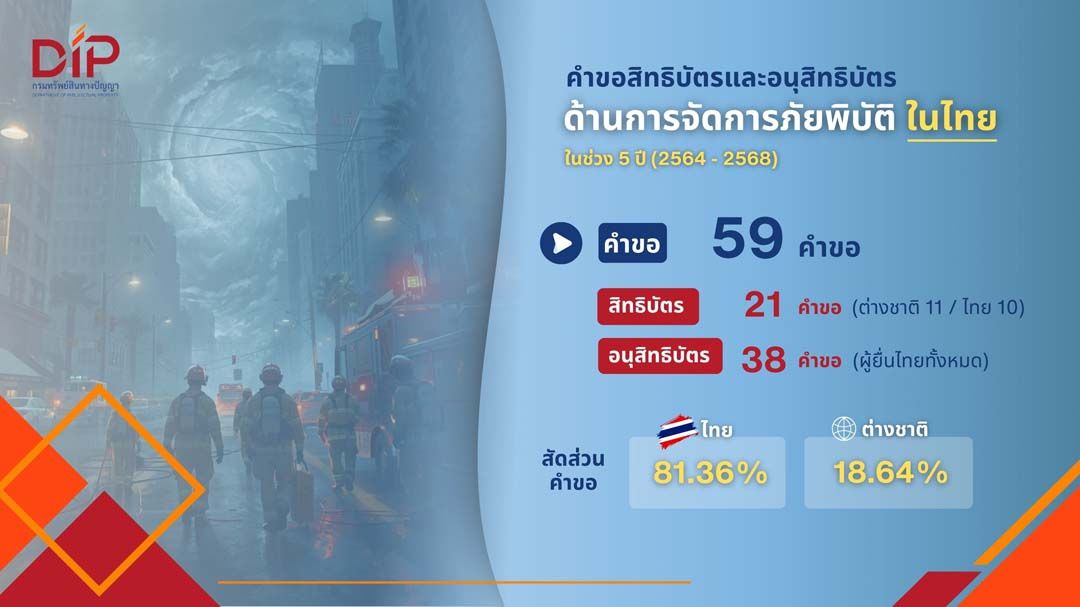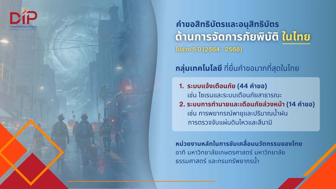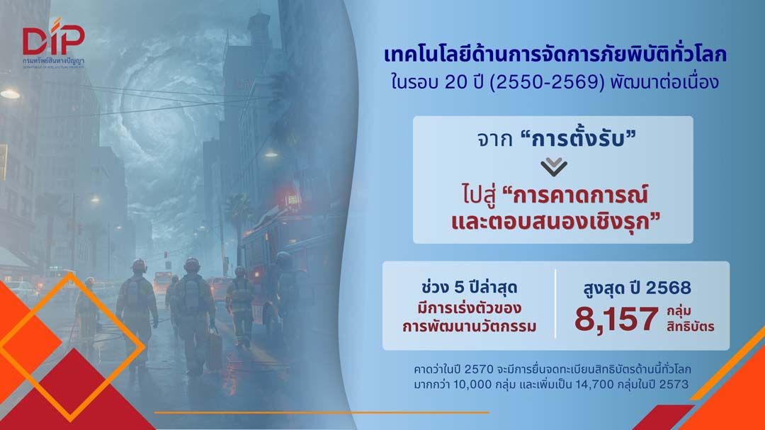 22 เมษายน 2569 นางอรมน ทรัพย์ทวีธรรม อธิบดีกรมทรัพย์สินทางปัญญา เปิดเผยว่า จากการวิเคราะห์ข้อมูลสิทธิบัตรทั่วโลกในรอบ 20 ปี (2550–2569) พบว่า เทคโนโลยีการจัดการภัยพิบัติมีการพัฒนาอย่างต่อเนื่องและกำลังอยู่ในช่วงการเติบโตของวงจรชีวิตเทคโนโลยี โดยในช่วงปี 2550 – 2552 มีการยื่นจดทะเบียนสิทธิบัตรน้อยกว่า 700 กลุ่มสิทธิบัตรต่อปี ขณะที่ช่วง 5 ปีที่ผ่านมา มีการเร่งตัวของนวัตกรรมอย่างชัดเจน โดยเฉพาะในปี 2568 ที่มีการยื่นจดทะเบียนสูงสุดที่ 8,157 กลุ่มสิทธิบัตร สอดคล้องกับความท้าทายของโลกจากการเปลี่ยนแปลงของสภาพภูมิอากาศ ภัยธรรมชาติที่รุนแรงขึ้น และความจำเป็นในการบริหารจัดการวิกฤตภัยพิบัติอย่างมีประสิทธิภาพ โดยคาดว่าในปี 2570 จะมีจำนวนการยื่นจดทะเบียนสิทธิบัตรทั่วโลกมากกว่า 10,000 กลุ่ม และเพิ่มเป็น 14,700 กลุ่มในปี 2573