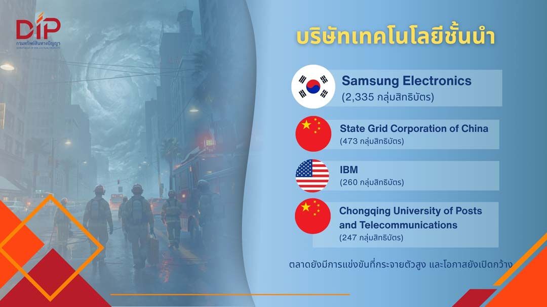 ทั้งนี้ หากพิจารณาที่บริษัทเทคโนโลยีชั้นนำ ผู้เล่นสำคัญในระบบนวัตกรรมจัดการภัยพิบัติ ได้แก่ Samsung Electronics (2,335 กลุ่มสิทธิบัตร) State Grid Corporation of China (473 กลุ่มสิทธิบัตร) IBM (260 กลุ่มสิทธิบัตร) และ Chongqing University of Posts and Telecommunications (247 กลุ่มสิทธิบัตร) อย่างไรก็ดี ผู้เล่นรายใหญ่ทั้ง 4 อันดับข้างต้น มีสัดส่วนสิทธิบัตรรวมกันไม่ถึง 12% ของสิทธิบัตรทั้งหมดในด้านนี้ สะท้อนให้เห็นว่าตลาดยังมีการแข่งขันที่กระจายตัวสูง และโอกาสยังเปิดกว้าง ในเชิงกลยุทธ์ อาทิ การพัฒนาสิทธิบัตรเฉพาะทางในประเทศหรือภูมิภาคที่ยังมีผู้เล่นไม่มาก การรวมทรัพย์สินทางปัญญาผ่านการควบรวมกิจการหรือการอนุญาตใช้สิทธิ (Licensing) การเชื่อมโยงเทคโนโลยีหลายสาขาเข้าด้วยกัน (Technology Convergence) อาทิ ปัญญาประดิษฐ์ (AI) การใช้เทคโนโลยี IoT (Internet of Things) และเซนเซอร์แบบเรียลไทม์ โดรนและหุ่นยนต์สำหรับกู้ภัย รวมถึง Digital Twin เพื่อจำลองสถานการณ์ภัยพิบัติ เป็นต้น