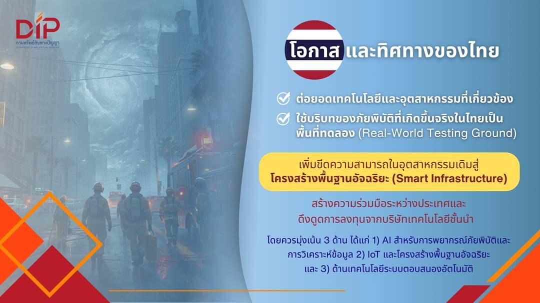ทั้งนี้ การผลักดันเทคโนโลยีดังกล่าวให้เกิดผลในเชิงพาณิชย์ จำเป็นต้องอาศัยการกระจายข้อมูลระหว่างหน่วยงาน โดยมีการจัดทำมาตรฐานกลางด้านข้อมูล (Data) และการเชื่อมโยงระบบ (Interoperability) ควบคู่กับการพัฒนาบุคลากรผู้เชี่ยวชาญด้าน AI และ Data Science เพื่อเร่งดำเนินมาตรการเชิงรุก อาทิ โครงการนำร่องเมืองอัจฉริยะด้านการจัดการภัยพิบัติ (Pilot Smart City for Disaster Management) โดยสนับสนุนการประยุกต์ใช้เทคโนโลยี AI และ IoT ที่สามารถนำไปใช้ประโยชน์ได้จริง การลงทุนพัฒนาระบบนิเวศสตาร์ทอัพด้านเทคโนโลยีภัยพิบัติ (Disaster Tech) การบูรณาการเชื่อมโยงระบบข้อมูลในระดับประเทศ รวมถึงการขยายความร่วมมือกับประเทศอาเซียนและประเทศที่เชี่ยวชาญในเทคโนโลยีภัยพิบัติต่างๆ ซึ่งหากไทยสามารถปรับตัวและใช้ประโยชน์จากทรัพย์สินทางปัญญาได้อย่างเหมาะสม จะเป็นโอกาสสำคัญในการสร้างมูลค่าเศรษฐกิจใหม่ และยกระดับขีดความสามารถในการรับมือภัยพิบัติอย่างยั่งยืนในระยะยาว