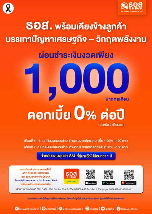 ธนาคารอาคารสงเคราะห์ (ธอส.) พร้อมช่วยบรรเทาปัญหาและดูแลลูกค้าที่ได้รับผลกระทบจากภาวะเศรษฐกิจและต้นทุนพลังงานที่ยังอยู่ในระดับสูง เตรียมกรอบวงเงิน 20,000 ล้านบาท จัดทำมาตรการช่วยเหลือลูกค้าผู้ได้รับผลกระทบทางเศรษฐกิจ (DC4) สำหรับลูกค้ากลุ่ม SM ที่กู้เงินมาแล้วไม่น้อยกว่า 1 ปี และได้รับผลกระทบจากเศรษฐกิจทำให้ไม่สามารถผ่อนชำระเงินงวดได้ โดยผ่อนชำระเงินงวดเพียง 1,000 บาทต่อเดือน อัตราดอกเบี้ย 0% เป็นระยะเวลา 3 เดือน ลงทะเบียนเข้าร่วมมาตรการผ่าน Application : GHB ALL BFRIEND ตั้งแต่วันนี้ถึงวันที่ 31 ธันวาคม 2569