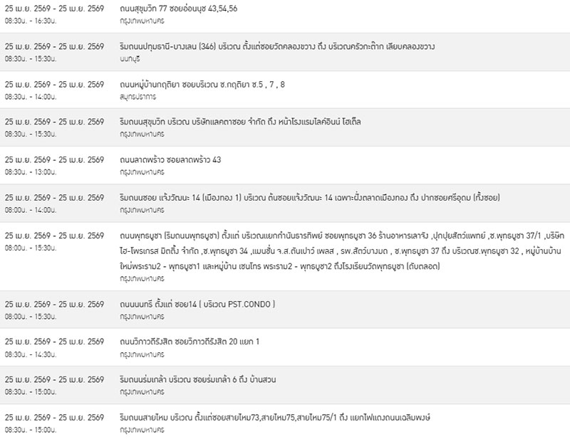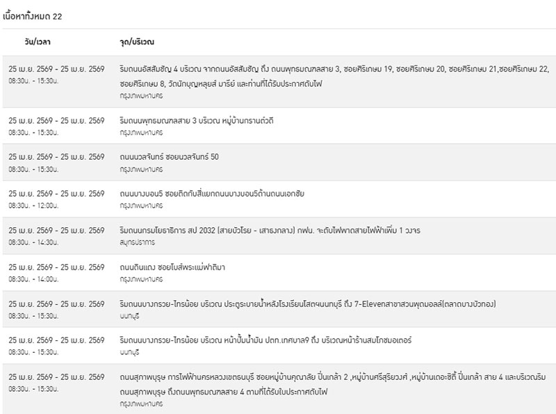 ทั้งนี้ เพื่อให้เกิดความปลอดภัยในการปฏิบัติงาน กฟน. จึงจำเป็นต้องงดจ่ายกระแสไฟเป็นการชั่วคราวให้กับบริเวณพื้นที่จำนวนทั้งหมด 22 จุด ในพื้นที่ดังต่อไปนี้