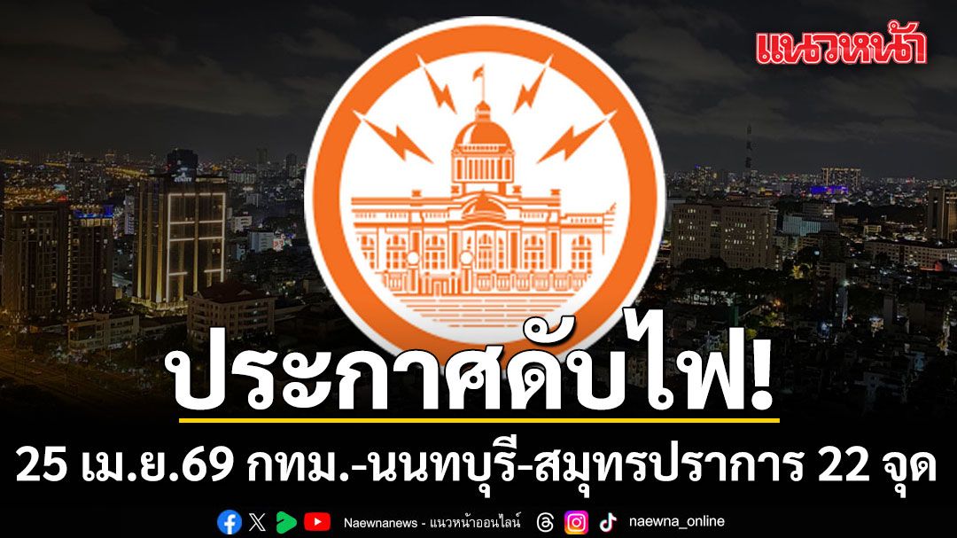 วันที่ 24 เมษายน 2569 การไฟฟ้านครหลวง (กฟน.) ประกาศเรื่อง มีความจำเป็นต้อง “ดับไฟ” ในพื้นที่กรุงเทพมหานคร นนทบุรี และ สมุทรปราการ ในวันเสาร์ที่ 25 เมษายน 2569 เพื่อพัฒนาหรือบำรุงรักษาระบบการจ่ายกระแสไฟฟ้าให้มีประสิทธิภาพยิ่งขึ้น