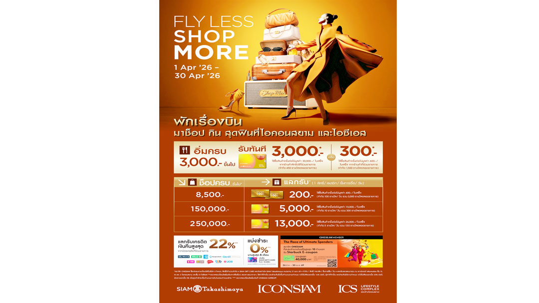 จัดแคมเปญ “FLY-LESS SHOP-MORE” ตั้งแต่วันนี้ถึง 30 เมษายน 2569 ที่ไอคอนสยาม และไอซีเอส ไลฟ์สไตล์ คอมเพล็กซ์ มอบสิทธิประโยชน์สุดคุ้มให้สมาชิก ONESIAM เพียงอิ่มอร่อยกับอาหารและเครื่องดื่มครบ 3,000 บาทขึ้นไป รับ SIAM GIFT CARD มูลค่า 3,000 บาท สำหรับการซื้อสินค้าครั้งต่อไปครบ 30,000 บาทขึ้นไป/ใบเสร็จ ในร้านค้าลักชัวรีที่ร่วมรายการ หรือแลกรับทันที SIAM GIFT CARD มูลค่า 300 บาท สำหรับซื้อสินค้าครั้งต่อไปครบ 600 บาทขึ้นไป/ใบเสร็จ จากร้านค้าที่ร่วมรายการ ,ช้อปครบ 8,500 บาทขึ้นไป แลกรับคูปองเงินสด SIAM Takashimaya มูลค่า 200 บาท สำหรับซื้อสินค้าครั้งต่อไปครบ 400 บาทขึ้นไป/ใบเสร็จ ,ช้อปครบ 150,000 บาทขึ้นไป แลกรับ SIAM GIFT CARD มูลค่า 5,000 บาท สำหรับซื้อสินค้าครั้งต่อไปครบ 10,000 บาทขึ้นไป/ใบเสร็จ