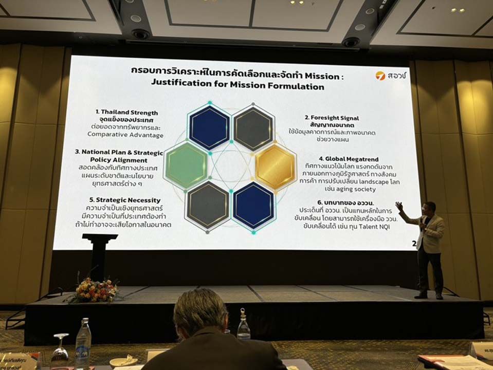 พร้อมกันนี้ ยังได้สะท้อนทิศทางการจัดทำกรอบนโยบาย อววน. พ.ศ. 2571–2575 ที่มุ่งใช้วิทยาศาสตร์ วิจัยและนวัตกรรมในการแก้โจทย์ประเทศและสร้างโอกาสใหม่ โดยใช้แนวทาง Mission Portfolio เพื่อบริหารโครงการอย่างยืดหยุ่น สามารถปรับเปลี่ยนทรัพยากรและสำรวจทางเลือกที่หลากหลาย เพื่อบรรลุเป้าหมายร่วมกันอย่างมีประสิทธิภาพ