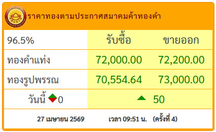 วันนี้ 27 เมษายน 2569 สมาคมค้าทองคำได้ประกาศราคาทองคำวันนี้ (ครั้งที่ 4) เมื่อเวลา 09.51 น. ที่ผ่านมา พบว่าราคามีการปรับตัว ลดขึ้น 50 บาท ส่งผลให้ราคาทองคำแท่ง 96.5% รับซื้อบาทละ 72,000 บาท ขายออกบาทละ 72,200 บาท ส่วน ทองรูปพรรณ 96.5% รับซื้อบาทละ 70,554.64 บาท ขายออกบาทละ 73,000 บาท