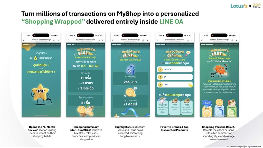 Lotus’s เลือกยกระดับการใช้ข้อมูลลูกค้าจากการสื่อสารโปรโมชันทั่วไป สู่กิจกรรม “Shopping Wrapped” บันทึกสตอรี่การช้อปสุดประทับใจของลูกค้าบน LINE OA ผ่านแคมเปญ “My Lotus’s Fest 2025 ช้อปสตอรี่ บันทึกความคุ้ม” โดยนำข้อมูลของลูกค้ามาวิเคราะห์ด้วย AI เพื่อแบ่งกลุ่มสมาชิกออกเป็น persona ที่หลากหลาย ก่อนถ่ายทอดออกมาผ่านหน้ากิจกรรมบน LINE OA สรุปสถิติพฤติกรรมการใช้จ่าย ความคุ้มค่า และหมวดสินค้าที่ชื่นชอบของตัวเองในรูปแบบที่เข้าใจง่าย น่าจดจำ