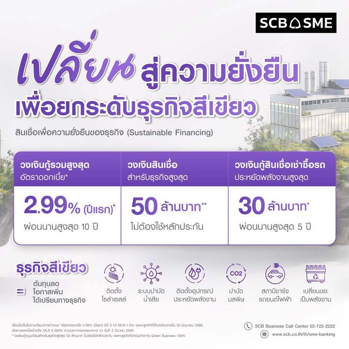 ผู้ประกอบการที่สนใจ สินเชื่อเพื่อความยั่งยืนของธุรกิจ (Sustainable Financing) สามารถติดต่อผู้จัดการธุรกิจสัมพันธ์ หรือ SCB Business Call Center โทร. 02-722-2222 ตั้งแต่วันนี้ – 30 มิถุนายน 2569