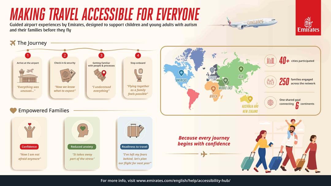 เอมิเรตส์เดินหน้าตอกย้ำความมุ่งมั่นในการส่งเสริมการเดินทางที่เข้าถึงได้และครอบคลุมสำหรับทุกคน ผ่านโครงการ Emirates Travel Rehearsal ที่ประสบความสำเร็จอย่างต่อเนื่องในกว่า 40 เมืองทั่วโลก โดยมีครอบครัวที่เข้าร่วมโครงการแล้วกว่า 250 ครอบครัวตลอดปีที่ผ่านมา โครงการดังกล่าวได้รับการออกแบบมาเพื่อสนับสนุนเด็กและเยาวชนที่มีภาวะออทิสติกได้ฝึกซ้อมประสบการณ์การเดินทางที่สนามบินก่อนการเดินทางจริง อันเป็นการลดความกังวลและเสริมสร้างความมั่นใจให้กับเยาวชนและครอบครัว