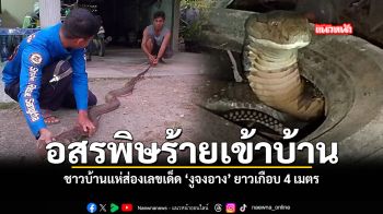 อสรพิษร้ายเข้าบ้าน ชาวบ้านแห่ส่องเลขเด็ด งูจงอาง ยาวเกือบ 4 เมตร