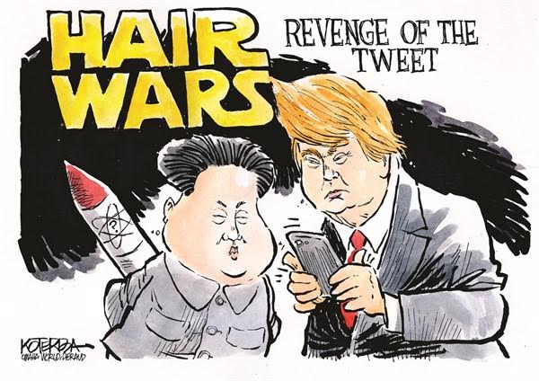 แทนที่จะหวาดกลัว พี่คิมเด็กแว้นซ์โลกก็ยักไหล่แบบไม่ยี่หระ แถมบอกอีกด้วยว่า ส่งมาเถอะ จะกี่ฝูงก็จัดมา ข้าอัดเอ็งเละแน่ๆ ตาทรัมป์ แต่มาใกล้ๆ นะ ยิ่งใกล้ยิ่งดี จะเตะสั่งสอนไอ้ลุงแซมให้อ่วมเลยแหละ แล้วประกาศก้องโลกว่า หากลุงแซมโจมตีดินแดนโสมแดง ก็จะปะฉะดะด้วยการถล่มโจมตีฐานทัพของสหรัฐฯ ในแปซิฟิกและทำเนียบประธานาธิบดีเกาหลีใต้ คำขู่ของเด็กแว้นซ์เล่นเอาอาเฮียสี ประธานาธิบดีจีนสีตกทันทีพลางโบกมือว่อนๆ ทั้งสองฝั่ง