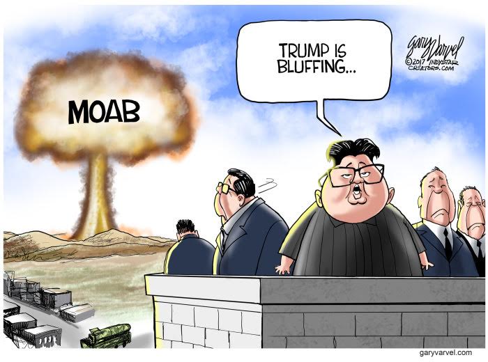 ช่วงต้นเดือนเมษายน จู่ๆ ป๋าทรัมป์ก็ประเคนจรวดโทมาฮอว์คใส่ซีเรียถึง 59 ลูกแบบจัดเต็ม โดยอ้างว่าต้องการตอบโต้ที่ผู้นำซีเรียใช้ก๊าซพิษสังหารหมู่ประชาชน และยังทำเพื่อ “ปกป้องผลประโยชน์” ก็ไม่ใช่ผลประโยชน์ใครที่ไหน ก็ผลประโยชน์ของลุงแซมเองนี่แหละ ป๋าทรัมป์มีหุ้นอยู่ในบริษัทผลิตโทมาฮอว์คด้วย เพียงชั่วตดยังไม่ทันหายเหม็น ในช่วงที่คนไทยกำลังสาดน้ำสงกรานต์กันอย่างชื่นฉ่ำ ลุงทรัมป์ก็เขย่าโลกอีกหนด้วยการหย่อนระเบิดขนาดยักษ์ที่เรียกกันเล่นๆ ว่า “โคตรแม่ระเบิด” หรือจีบียู-43/บี (GBU-43/B) หรือในชื่อเล่น เอ็มโอเอบี (Massive Ordnance Air Blast) จากเครื่องบิน MC-130 ในเขตอะชิน จังหวัดนันกาฮาร์ ทางภาคตะวันออกของอัฟกานิสถานติดกับชายแดนปากีสถาน คาดว่านี่คืออีกหนึ่งการทดสอบอาวุธของลุงแซม