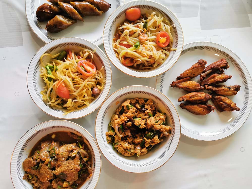 สิ่งที่ขาดไม่ได้ของอาหารอีสาน คือส้มตำ เทียบได้กับสลัดของฝรั่ง ส้มตำทุกอย่างของที่นี่ทุกชนิดรสพอดีกิน ไม่ได้เผ็ดโลดโผนหรือรสจัดจนคอแห้ง ตำไทย ตำปู ตำปลาร้า ตำแตงกวา ตำมะม่วง ตำถั่วฝักยาว ตำกุ้งสด ตำไทยแครอท ซุบหน่อไม้ ให้เลือกตามอัธยาศัย