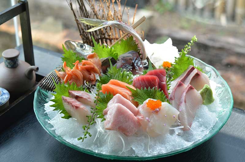 ด้วยกลิ่นอายของเนื้อปลาเหมือนนั่งอยู่ริมหาดสะพานปลาที่ญี่ปุ่น จัดใส่จานประดับอย่างได้จิตวิญญาณของเขา พรั่งพร้อมด้วยปลาชั้นสุดยอดส่งจากเที่ยวบินด่วนสัปดาห์ละสองเที่ยวบิน มีทั้งโอโทโร ฮามาจิ แซลมอน มาได หอยเชลล์ หอยคราง รวมทั้งไข่หอยเม่น วาซาบิที่ฉุนจัด ไม่ควรกวนวาซาบิในซอสโชยุให้ผิดวิถีการกินของเขา เพราะจานนี้คือสุดยอดปลาที่ไม่เข้ากันเหมือนการกินปลาดิบจุ่มน้ำจิ้มซีฟู้ด